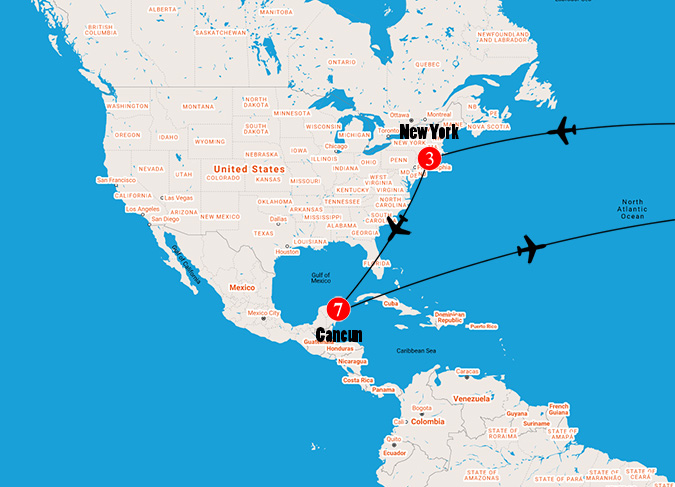 The distance between cities calculated based on their latitudes and longitudes. It ends in Cancun Mexico. The flight distance from Cancún Mexico to New Orleans United States is 640 miles.